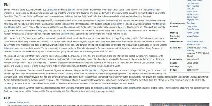 Confira abaixo um print da página da Wikipedia em inglês com a trama incorreta de Eternos. É possível que, em breve, tudo seja editado para que os detalhes reais sejam incluídos.