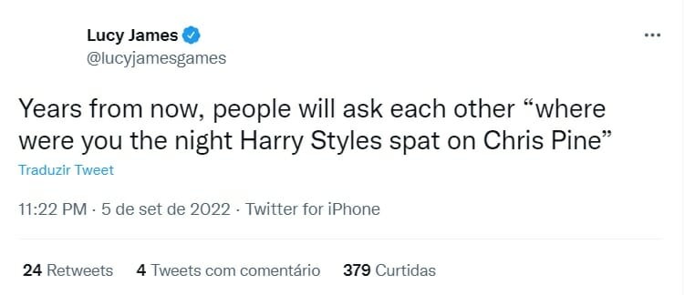 Uma internauta comentou: “Daqui alguns anos, as pessoas vão perguntar umas as outras ‘Onde estavam na noite em que Harry Styles cuspiu em Chris Pine'”