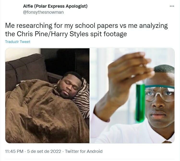 Outro postou uma foto do rapper 50 Cent dormindo e outra de um cientista e brincou: “Eu fazendo a pesquisa para meus trabalhos da faculdade versus eu analisando as imagens da cuspida de Harry Styles em Chris Pine”