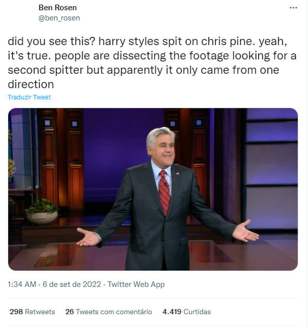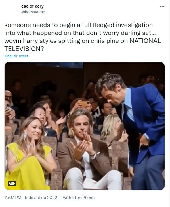Mais um fã postou imagens do ocorrido e comentou: “Alguém precisa começar uma investigação apurada sobre o que aconteceu naquele set de Não se Preocupe Querida… O que significa Harry Styles cuspindo em Chris Pine em REDE NACIONAL?”