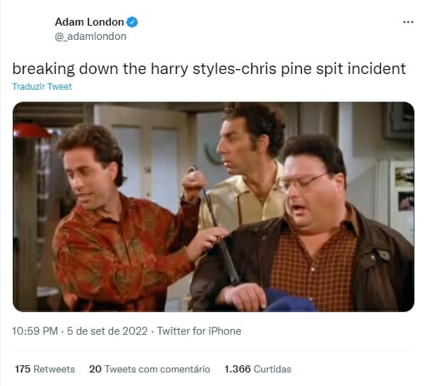 “Você viu isso? Harry Styles cuspiu um Chris pine, é, é verdade. Pessoas estão dissecando as imagens procurando por um segundo cuspidor mas aparentemente só veio de ‘One Direction'” brincou outro usuário do Twitter.