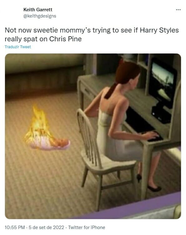 Enquanto outro fã postou um print de The Sims com a mãe no computador e um bebê pegando fogo do lado, e escreveu “Agora não querido, a mamãe está tentando ver se Harry Styles realmente cuspiu no Chris Pine”