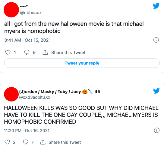 “Halloween Kills foi tão bom, mas por que Michael Myers matou o casal gay? Confirmado que ele é homofóbico”, opinou um terceiro.