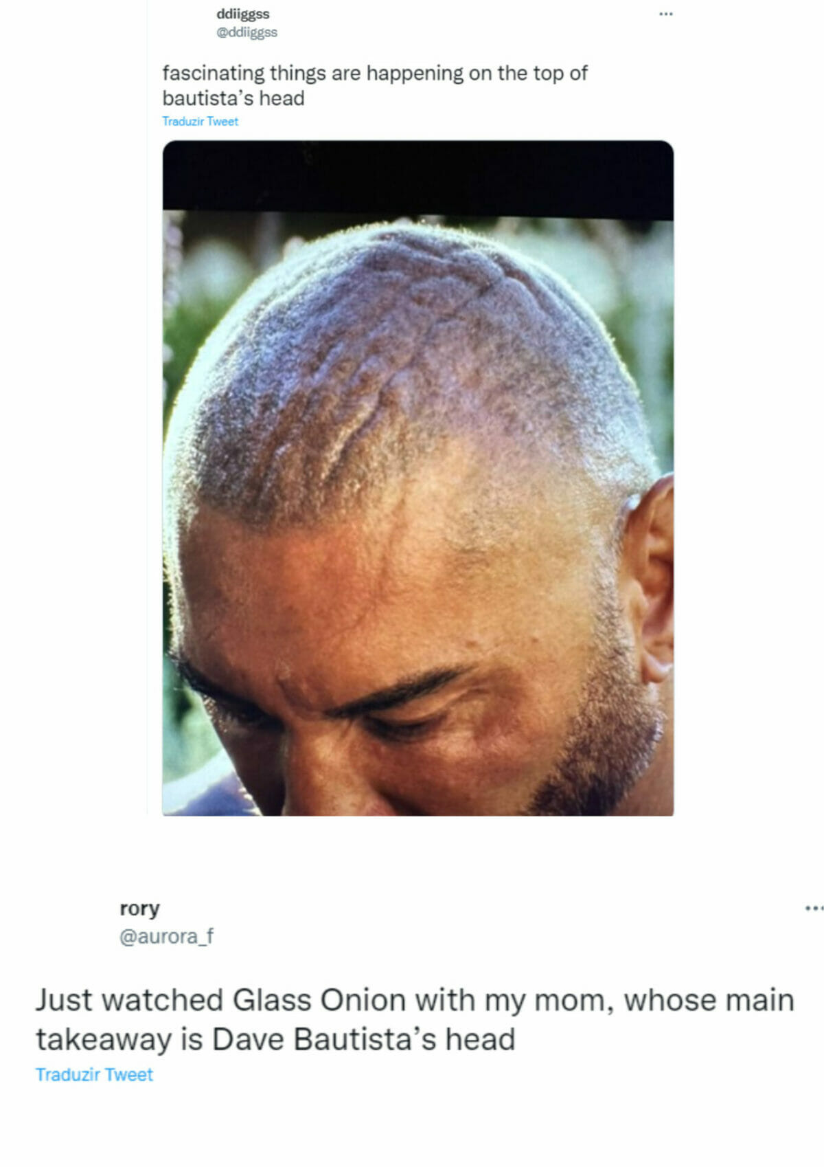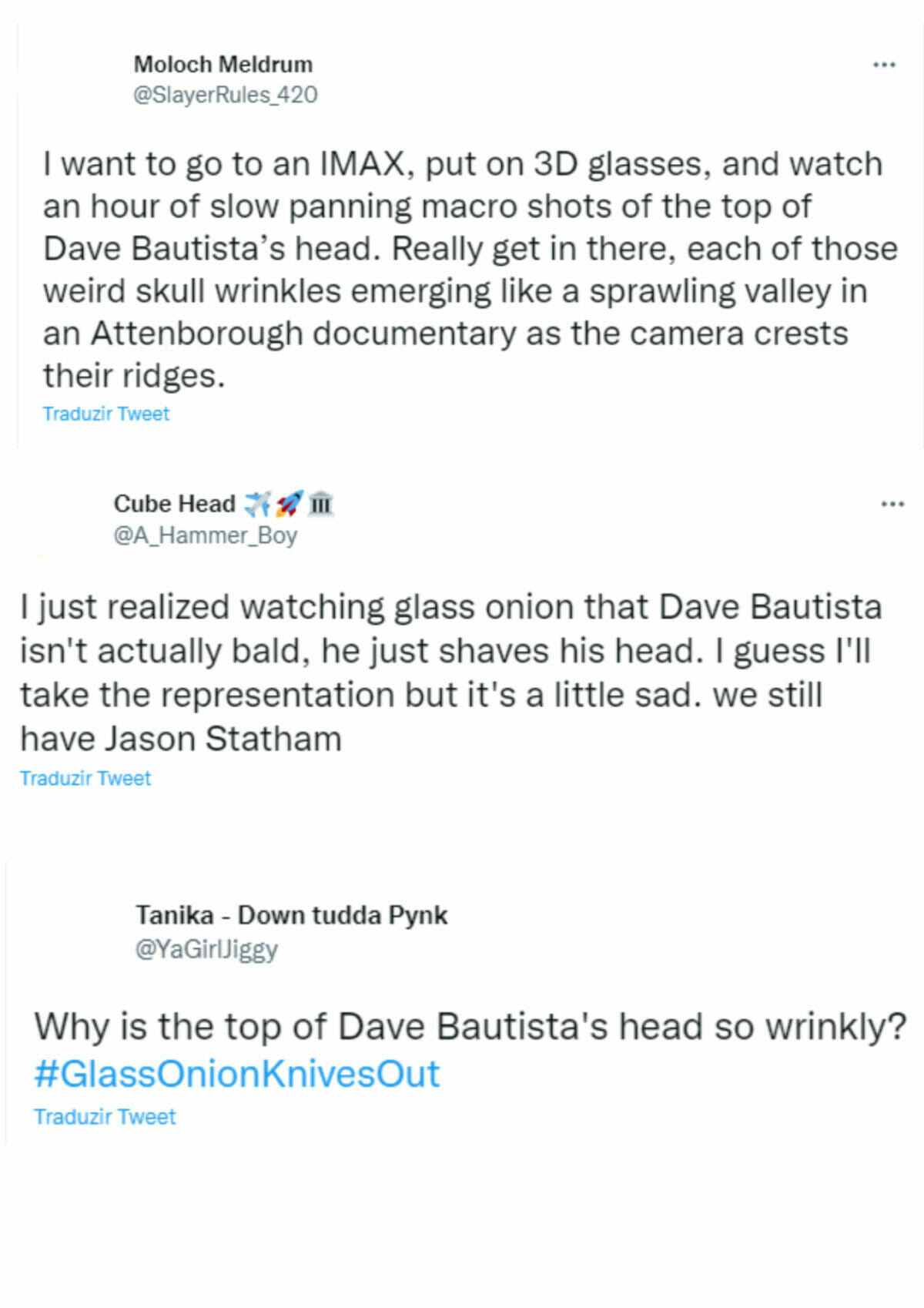 “Acabei de assistir Glass Onion com minha mãe, cuja principal conclusão é a cabeça de Dave Bautista”, comentou outra fã.