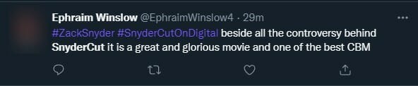 “Apesar de toda a controvérsia, o Snydercut é um filme maravilhoso e glorioso e um dos melhores baseados em quadrinhos”, tuitou um fã.