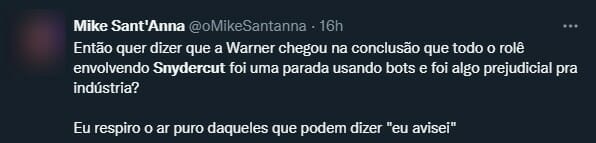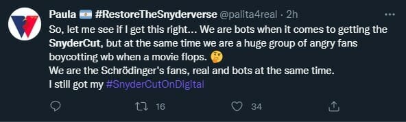 “Então deixa eu ver se entendi. Somos robôs quando o assunto é conseguir o Snydercut, mas ao mesmo tempo somos um grande grupo de fãs raivosos boicotando a Warner Bros quando um filme fracassa. Somos fãs de Schrödinger, reais e robôs ao mesmo tempo. Ainda comprei o Snydercut digitalmente”.
