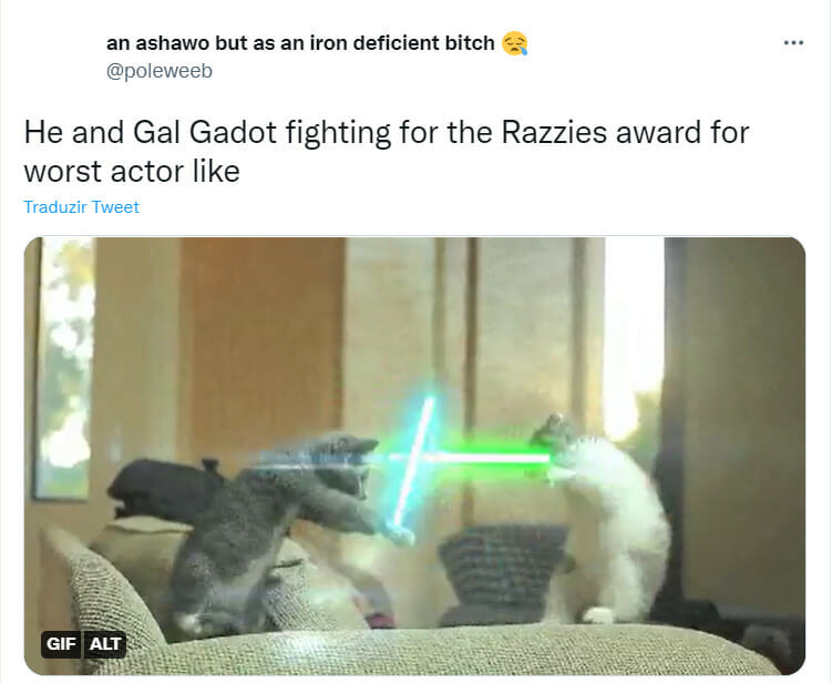Com um gif de gatinhos brigando com sabres de luz uma outra pessoa comparou Styles com Gal Gadot: “Ele e Gal Gadot lutando pelo Framboesa de Outro de pior ator assim.”