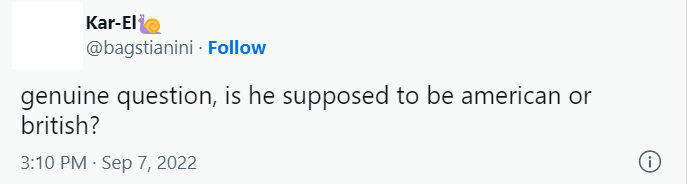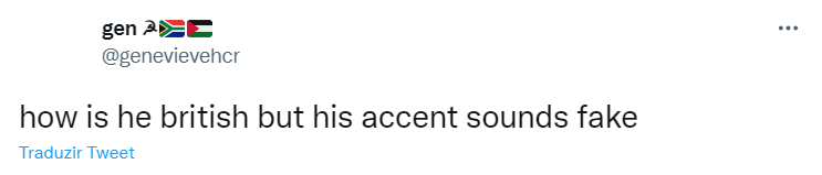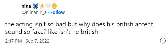 Outra usuária do Twitter disse: “A atuação não é tão ruim, mas por que o sotaque britânico dele soa tão falso? Tipo, ele não é britânico?”