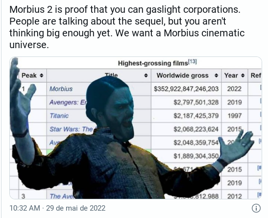 Acontece que a recepção de Morbius foi tão, mas tão negativa que se tornou uma espécie de meme tratar o longa-metragem como se fosse uma produção cultuada.
