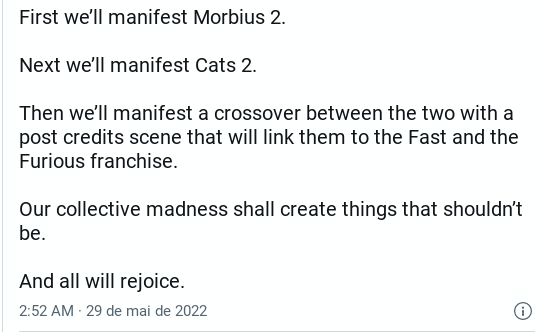 Com os internautas tirando sarro, a brincadeira se popularizou rapidamente. Agora, muitos estão pedindo que a Sony desenvolva Morbius 2, e está mais do que claro que os memes vão continuar por muito tempo.