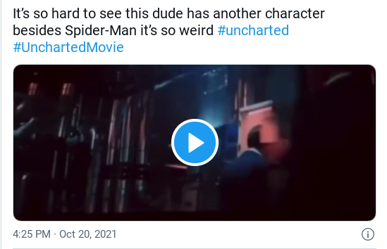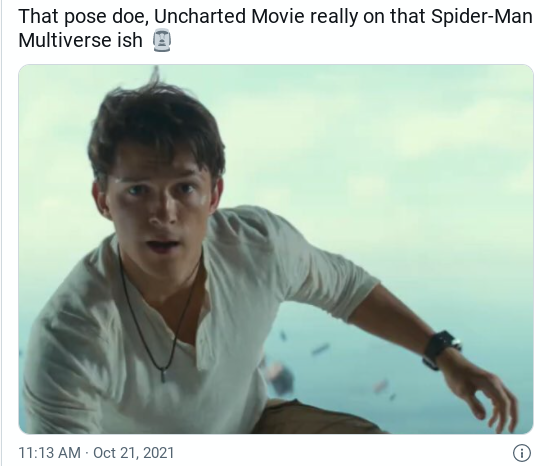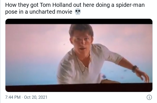 Um internauta compartilhou um print da cena no Twitter e escreveu: “Tom Holland fazendo a pose do Homem-Aranha em Uncharted: Fora do Mapa.”