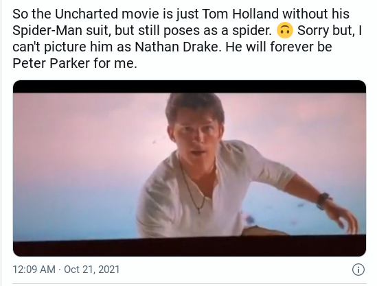 Outra pessoa expressou: “Tom Holland não usa o traje de Homem-Aranha em Uncharted: Fora do Mapa, mas ainda faz a pose. Não consigo imaginá-lo de Nathan Drake. Ele sempre será o Peter Parker para mim.”