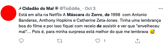 No Twitter, alguns assinantes da Netflix relembram com carinho de A Máscara do Zorro. Confira abaixo as reações.