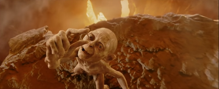 A trilogia épica de Peter Jackson mais de perto mostra Frodo, Sam e Gollum finalmente chegando ao Monte da Perdição. Frodo coloca o anel, Gollum arranca o dedo com uma mordida e então os dois têm uma luta final, levando ambos a cair da borda.