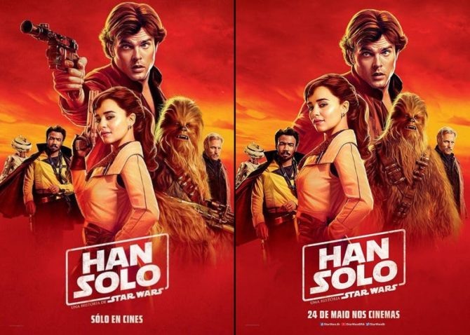 A Disney divulgou recentemente os pôsteres brasileiros de Han Solo: Uma História Star Wars. Eles são basicamente idênticos aos originais americanos, mas tem uma diferença notável: eles não possuem blasters, as famosas armas lasers utilizadas pelos heróis do longa.