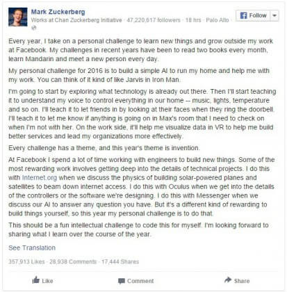 “Minha meta pessoal para 2016 é construir uma I.A. para gerenciar minha casa e me ajudar no meu trabalho. Você pode pensar nisso como uma espécie de Jarvis do Homem de Ferro”, disse o executivo.