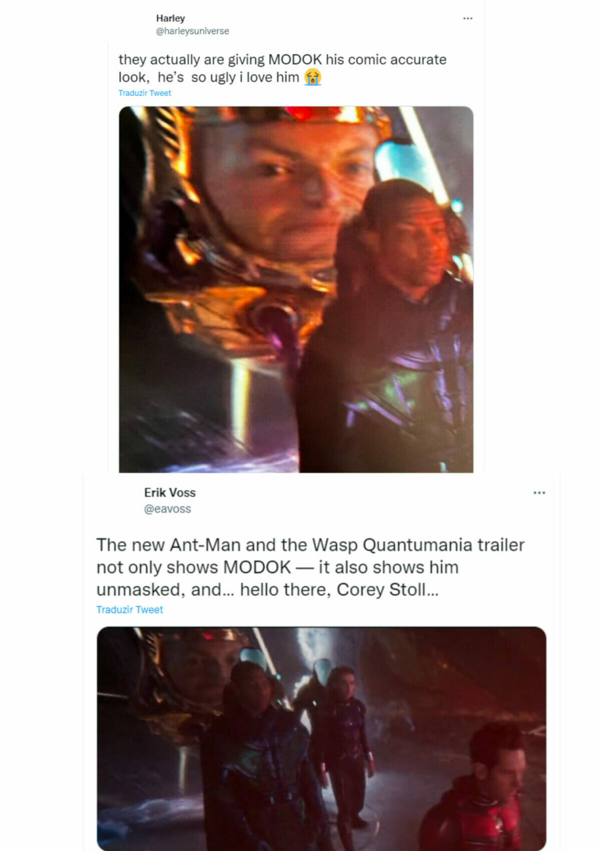 “O novo trailer de Homem-Formiga e a Vespa: Quantumania não mostra apenas MODOK – também o mostra desmascarado e… olá, Corey Stoll…”, disse outro fã.