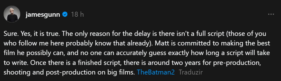 Ao ser questionado na rede social Threads, Gunn afirmou que Matt Reeves, diretor do longa, está comprometido a entregar o seu melhor e a demora é compreensível. “A única razão para o adiamento é que ainda não temos um roteiro finalizado (se você me segue, provavelmente deve saber). Matt [Reeves] está comprometido em entregar o melhor filme, e ninguém sabe o quão trabalhoso é montar um roteiro. Assim que estiver pronto, são mais ou menos dois anos entre pré-produção, gravações e pós-produção, principalmente quando se trata de filmes grandes”, afirmou o diretor.