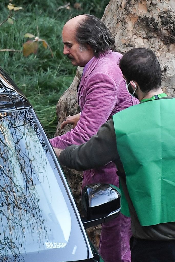 O ator está filmando cenas em Milão, sendo visto calvo, com fios grisalhos no cabelo e próteses para interpretar o estilista Paolo Gucci.