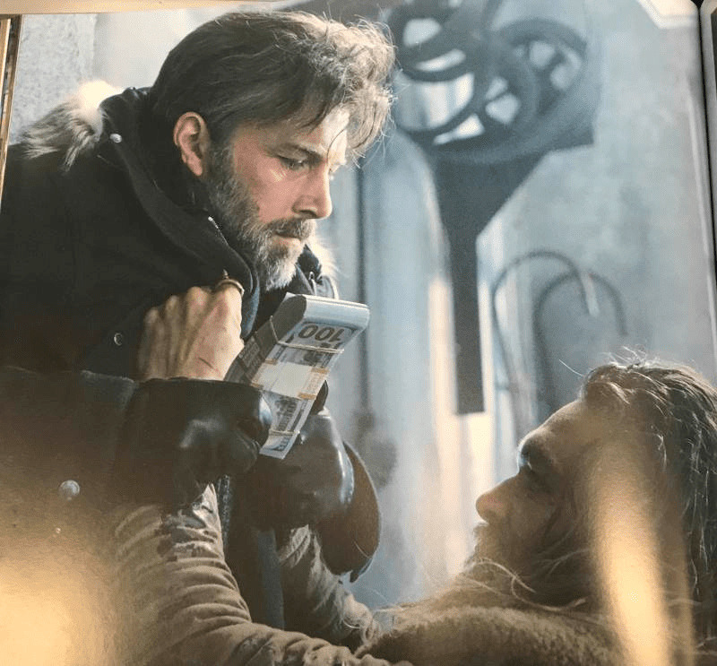 A foto mostra Bruce Wayne (Ben Affleck) em seu primeiro confronto com Aquaman (Jason Momoa), quando o herói de Atlantis inicialmente se recusa a se juntar à equipe, mas com uma diferença importante: o Batman tem dinheiro nas mãos.