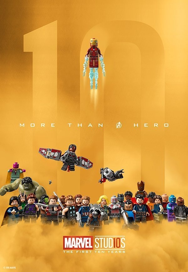 A LEGO Group resolveu aproveitar que a Marvel Studios está comemorando seus 10 anos e fazer um pôster especial com os personagens dos filmes do estúdio em suas formas LEGO.