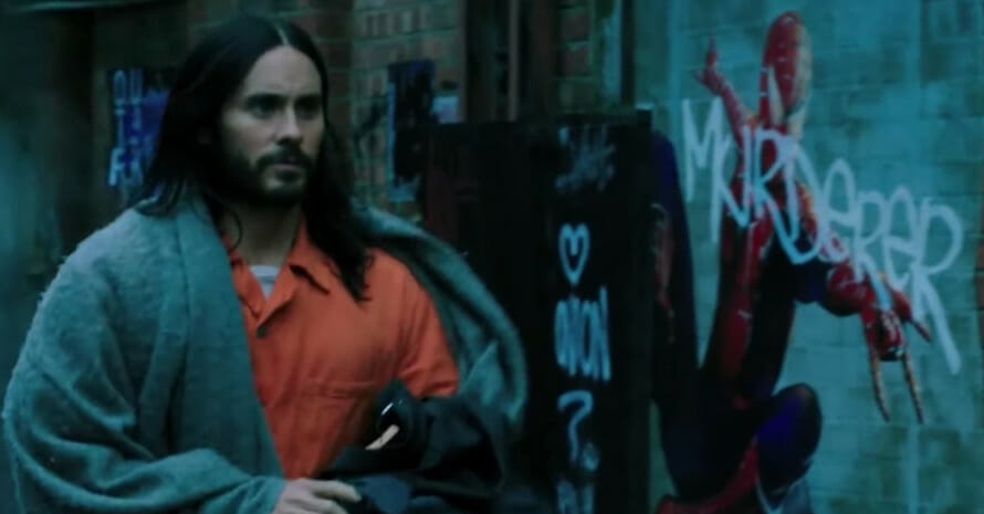 Morbius aparece andando pela rua quando, ao fundo, é mostrada uma parede com uma pichação do Homem-Aranha de Tobey Maguire, com a palavra “assassino” pintada com spray.