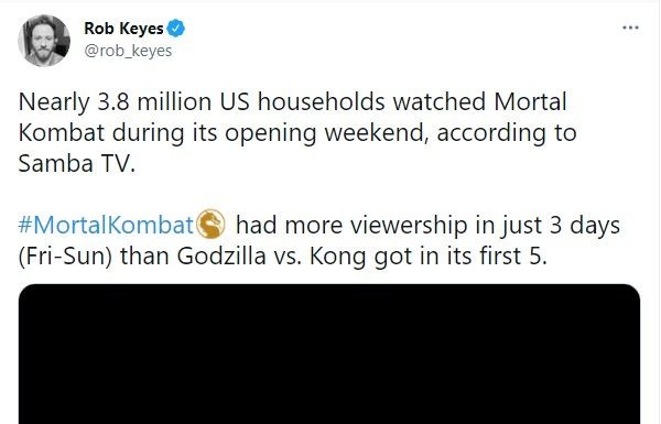“Quase 3,8 milhões de lares americanos assistiram ao Mortal Kombat durante o fim de semana de estreia, de acordo com a Samba TV”, escreveu Keyes no Twitter.