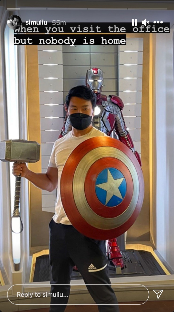Simu Liu, ator de Shang-Chi e a Lenda dos Dez Anéis do MCU, compartilhou uma imagem na sede do Marvel Studios posando com o escudo do Capitão América e o Mjolnir de Thor.