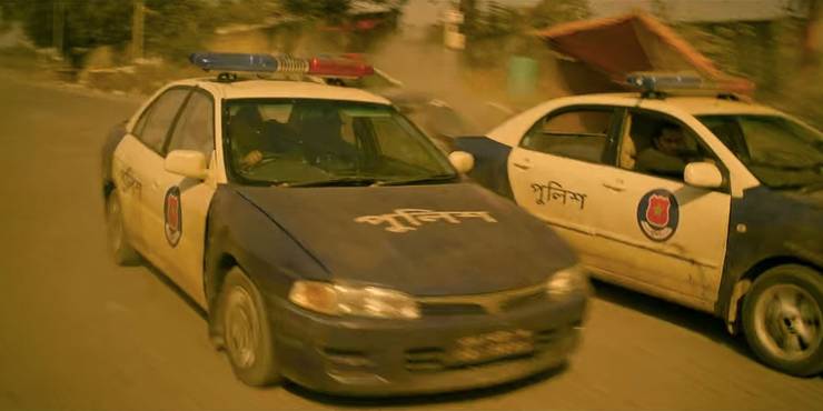 Com os policiais ainda em perseguição, o motorista de um deles de repente abre fogo contra o carro da polícia à sua direita, fazendo com que o carro colidisse com a câmera e depois mudando rapidamente para mostrar Saju ao volante do outro carro e com a arma na mão. Isso também oculta o próximo corte na cena.