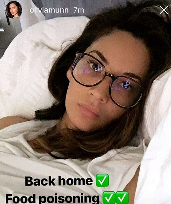 Na foto que você pode conferir mais abaixo, Munn aparece em repouso na sua casa, em Los Angeles (EUA), longe do set de filmagens em Vancouver (Canadá). Na legenda, ela revela que sofreu intoxicação alimentar.
