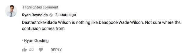 Agora, Ryan Reynolds, o intérprete de Deadpool nos cinemas, resolveu responder a brincadeira. Na página oficial do Youtube do trailer de Jovens Titãs em Ação! Nos Cinemas, Reynolds usou sua conta oficial para dizer: “Exterminador/Slade Wison não é o mesmo que Deadpool/Wade Wilson. Não sei de onde veio a confusão. Assinado: Ryan Gorling” brincou o ator (veja a resposta logo abaixo).