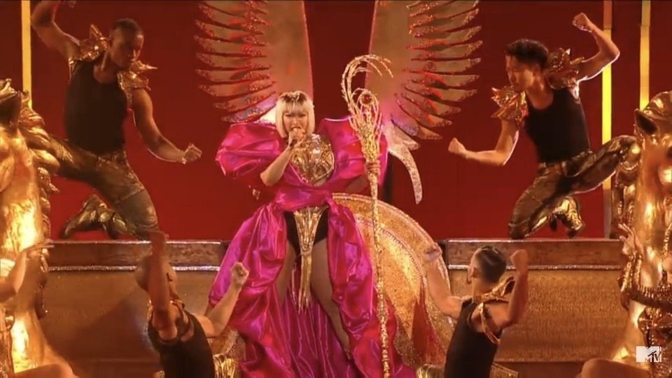 Minaj apresentou inúmeras canções de seu novo álbum, Queen, no VMA, incluindo a faixa Majesty. Durante a apresentação, o palco trazia um tema egípcio, com ouro por todos os lados.