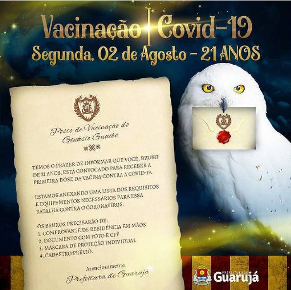 “Com essa brusca redução de idade, pensamos que foi como um passe de mágica. E um dos colaboradores sugeriu usar a carta de Hogwarts convocando os jovens de 25 anos ou mais para a vacinação”, explicou Hélio Martins, diretor de Comunicações da prefeitura.