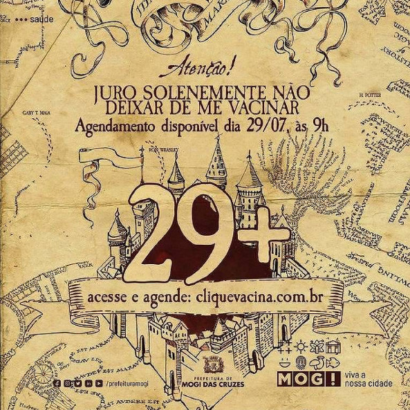 A prefeitura de Caieiras (SP) também usou Harry Potter para promover a vacinação, após a chegada de grande lote de doses ter adiantado a vacinação para maiores de 25 anos.