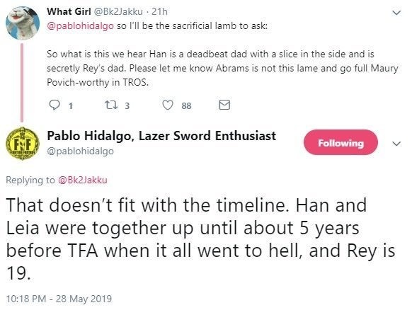 Porém, o rumor foi desmentido. Pablo Hidalgo, executivo e membro do grupo de história da LucasFilm, escreveu em seu Twitter que a hipótese não faz sentido graças à linha do tempo da nova trilogia.