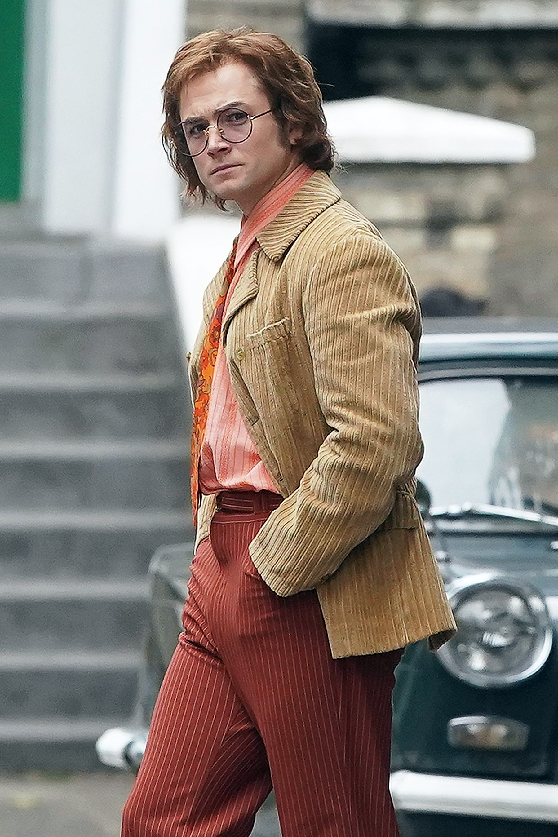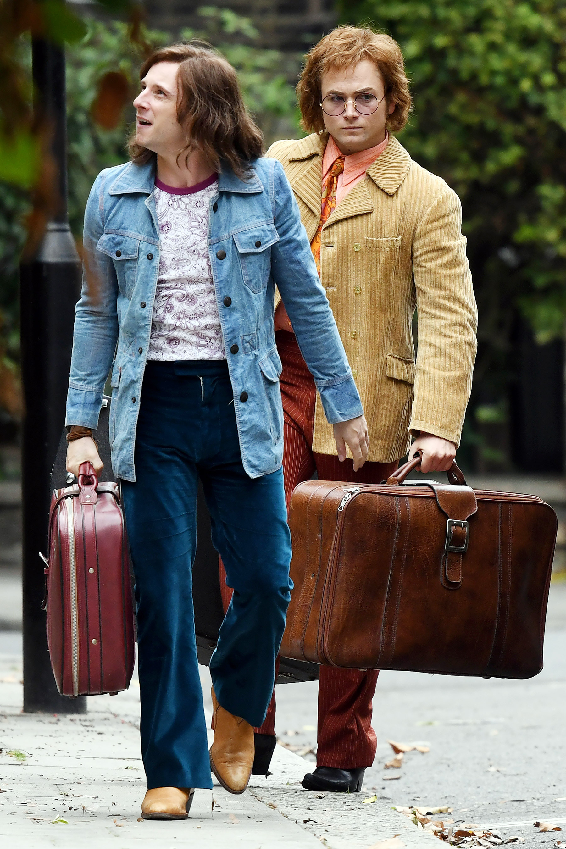 Taron Egerton foi flagrado nesta terça (11) em Londres, onde as gravações acontecem. O ator aparece ao lado de Jamie Bell, que no filme interpreta um antigo colaborador de Elton John, Bernie Taupin. Pelo figurino, pode-se indicar que a dupla grava cenas da década de 70.