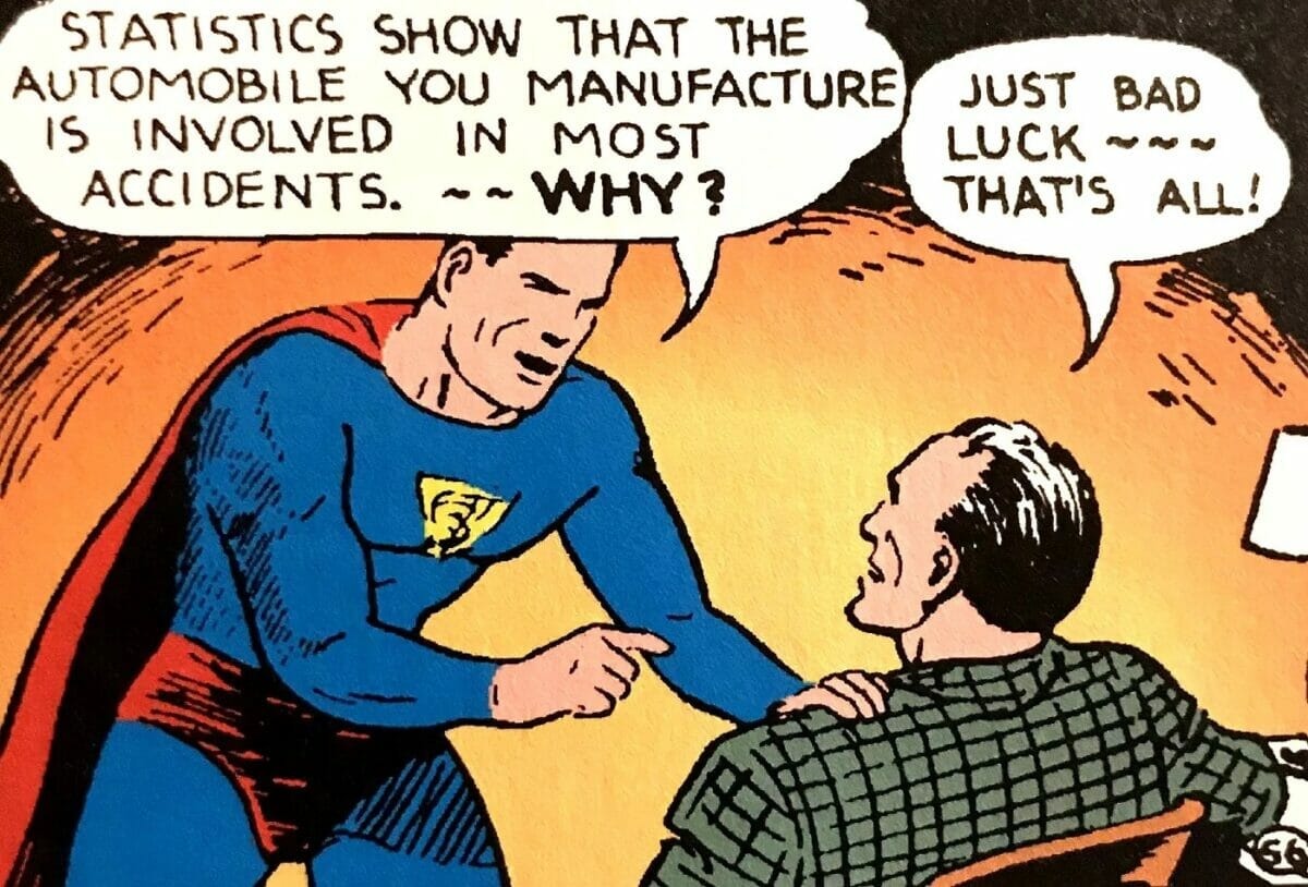 “Ele era um imigrante, como a maioria deles, mas não foi forçado a se vestir com os marrons e cinzas monótonos da maioria das outras pessoas nas linhas de pão da década de 1930. Ele estava vestindo cores primárias brilhantes e ele podia saltar sobre as ruas que eles estavam tendo que se arrastar para baixo à procura de trabalho. O primeiro Superman espancou os fura-greves e jogou um proprietário no horizonte. Obviamente, esse Superman não durou muito tempo. Ele logo foi tirado de seus criadores e virou um personagem de classe média e de direita, muito mais respeitável socialmente”.