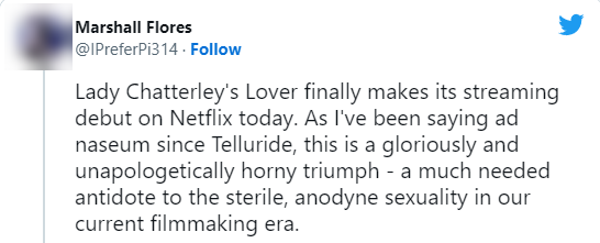 “O Amante de Lady Chatterley finalmente estreia na Netflix hoje. Conforme tenho dito desde Telluride, esse é um triunfo glorioso e orgulhoso da safadeza – um necessário antídoto à sexualidade estéril da nossa filmografia atual”, tuitou um fã.