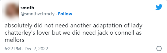 “Definitivamente não precisava de outra adaptação de O Amante de Lady Chatterley, mas precisava de Jack O’Connell como Mellors”, tuitou mais uma fã.