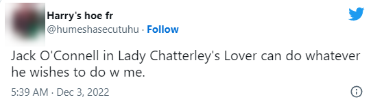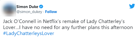“Jack O’Connell no remake da Netflix de O Amante de Lady Chatterley… não tenho mais planos para esta tarde”, tuitou outro fã.