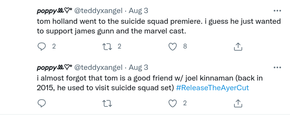 “Tom Holland foi para a estreia de O Esquadrão Suicida. Acho que ele só queria apoiar James Gunn e o elenco da Marvel”, escreveu um fã, que acabou lembrando-se: “Quase esqueci que Tom é um bom amigo de Joel Kinnaman (em 2015 ele costumava visitar o set de Esquadrão Suicida”.