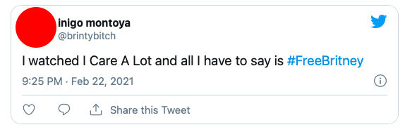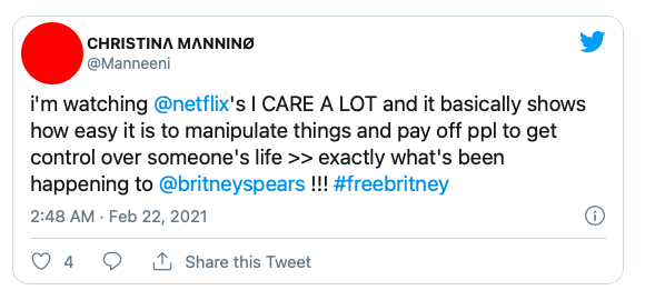 “Eu assisti Eu Me Importo na Netflix e mostra como é fácil manipular as coisas e pagar as pessoas para tomar controle da vida de alguém – exatamente o que acontece com Britney Spears”, afirmou ainda uma terceira.