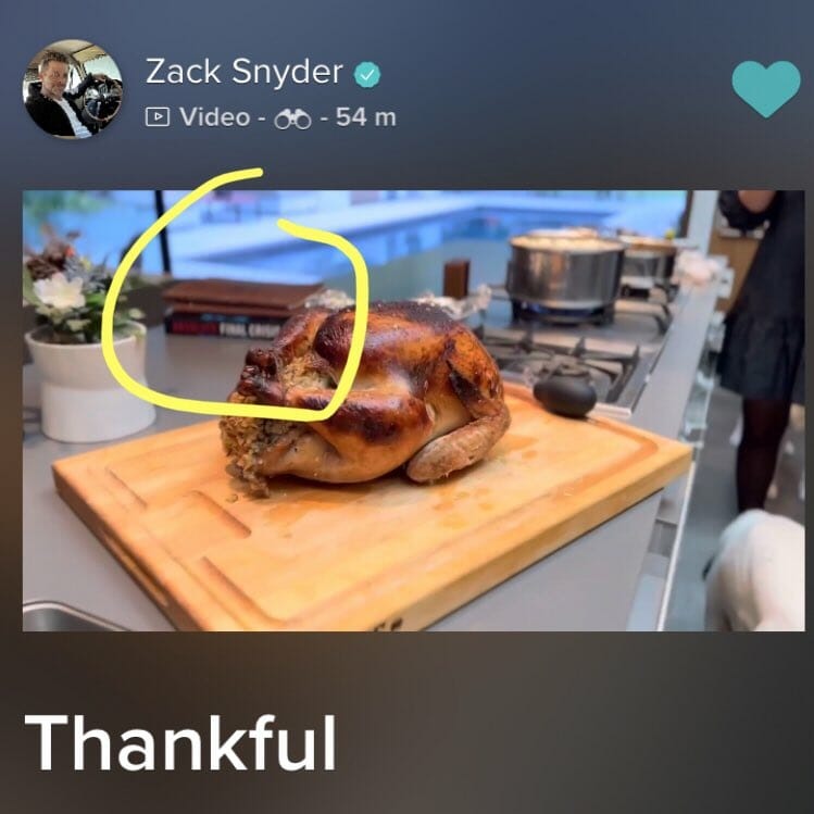 Como os internautas sabem, o diretor de Superman e Liga da Justiça ama deixar pistas nas postagens dele. Por isso, o vídeo mostrando o peru do Dia de Ação de Graças não é tão inocente assim para web.