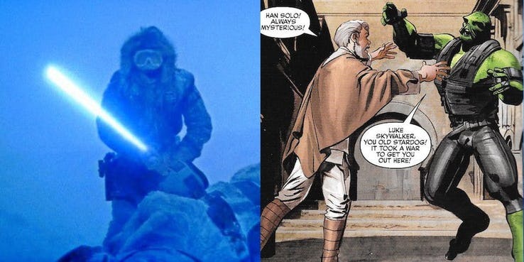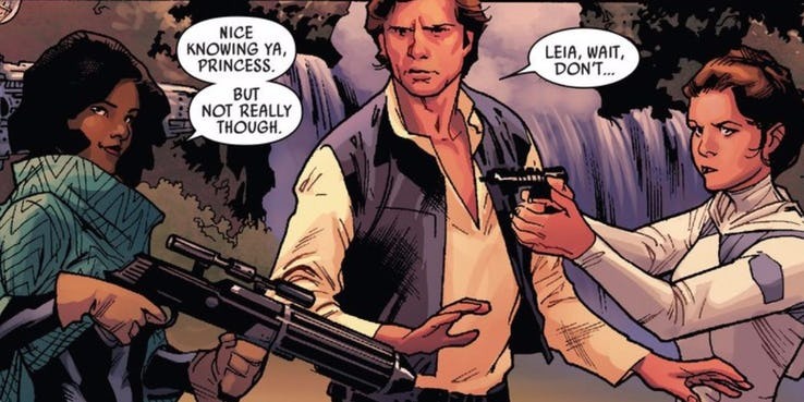 ELE JÁ FOI CASADO | Nos quadrinhos Star Wars #6, que se passam após os eventos do primeiro filme da saga, vemos Han Solo e Leia se encontrando por acaso com Sana Solo, que diz ser esposa do piloto. Han chega a negar que o casamento sequer tenha acontecido, muito embora fique claro que ele está mentindo apenas para conquistar Leia.