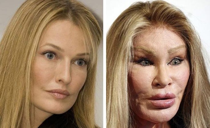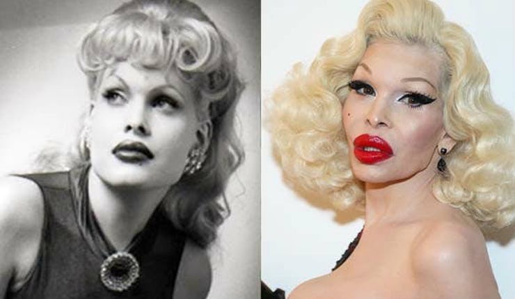 AMANDA LEPORE | A modelo, cantora, atriz e artista de performance transgênero sempre se apoiou em seu visual emulado das pin-ups, modelos de fotos clássicas de meados do século XX. No entanto, com o passar dos anos, Lepore usou a cirurgia plástica para levar seu look ao extremo, com preenchimento exagerado nos lábios e mudanças marcantes nos traços do rosto.