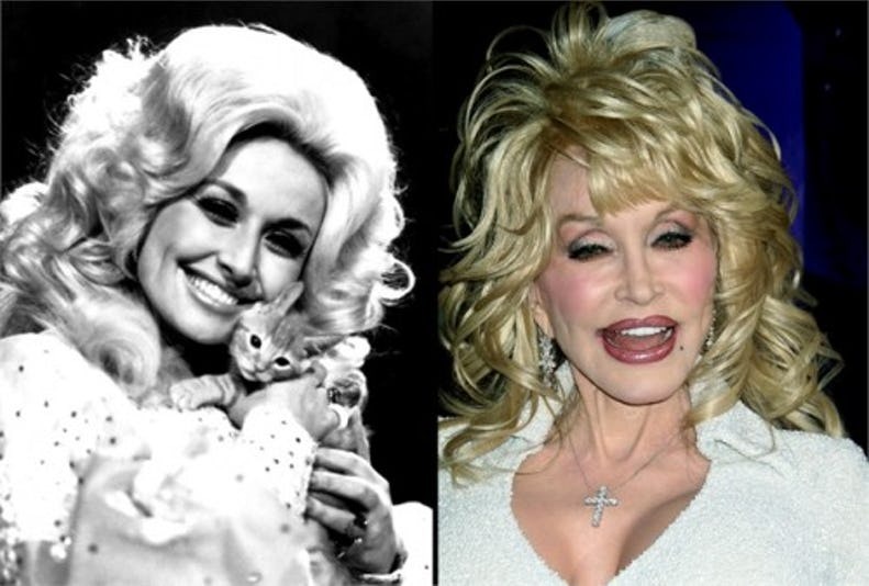DOLLY PARTON | O nome dela é praticamente sinônimo de sucesso no country americano, e Dolly também é atriz e empresária – uma mulher poderosa, sem dúvida nenhuma, que usou o dinheiro, em parte, para tentar manter a aparência jovial com o passar dos anos. Aos 71 anos, no entanto, Parton se parece com uma caricatura do que foi.