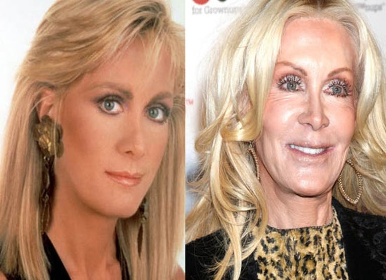 JOAN VAN ARK | A eterna Valene Ewing de Dallas e seu spin-off, Knots Landing, começou a aparecer mais raramente nas telas com o passar dos anos e das décadas, e seus esporádicos retornos aos holofotes se tornaram manchete mais pelo visual em constante transformação do que por seus papéis. As feições “congeladas” de Ark são mesmo meio assustadoras.