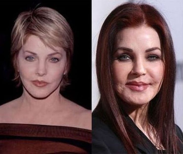 PRISCILLA PRESLEY | A ex-esposa de Elvis está com 72 anos, e atribui o visual sem rugas à cirurgia plástica, mas é assustador o que isso a custou – o rosto parece completamente deformado quando se compara com fotos antigas. Priscilla, que cultivou carreira de atriz entre os anos 1980 e 1990, não atua desde 1999.