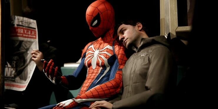 Em uma cena de Homem-Aranha no Aranhaverso, dá para ver uma coleção de trajes do Homem-Aranha, incluindo a roupa que o personagem usa nos jogos.