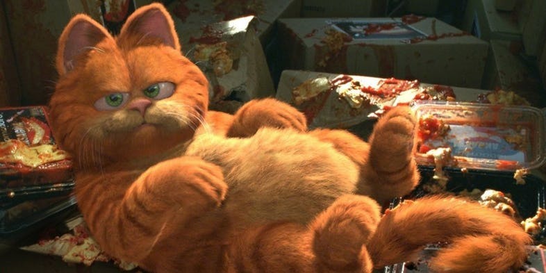 7) Nas histórias, Garfield nasceu na cozinha do restaurante italiano Mamma Leoni. Foi vendido para uma loja de animais quando quase levou o local à falência por comer todas as massas compradas pelo mestre cuca!